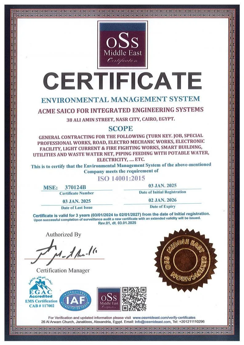 “تُعد اكمي ساعيكو شركة رائدة في مجال الإنشاءات والأنظمة الهندسية المتكاملة، تأسست عام 1985 ويقع مقرها الرئيسي في القاهرة، مصر. وبصفتها مقاولًا عامًا من الفئة (أ)، فقد نفذت الشركة العديد من المشاريع بسجلات سلامة متميزة، بدعم من فريق من المهنيين المهرة في مختلف أنحاء مصر.”