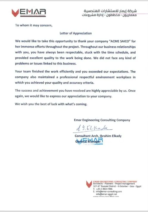 مكتبنا يتقدم بخالص الشكر والتقدير لشركتكم على الأداء المتميز في مشروع الجامعة المصرية الروسية، والذي يعكس التزامكم بالجودة والالتزام بالمواعيد. ونتمنى لكم دوام النجاح.