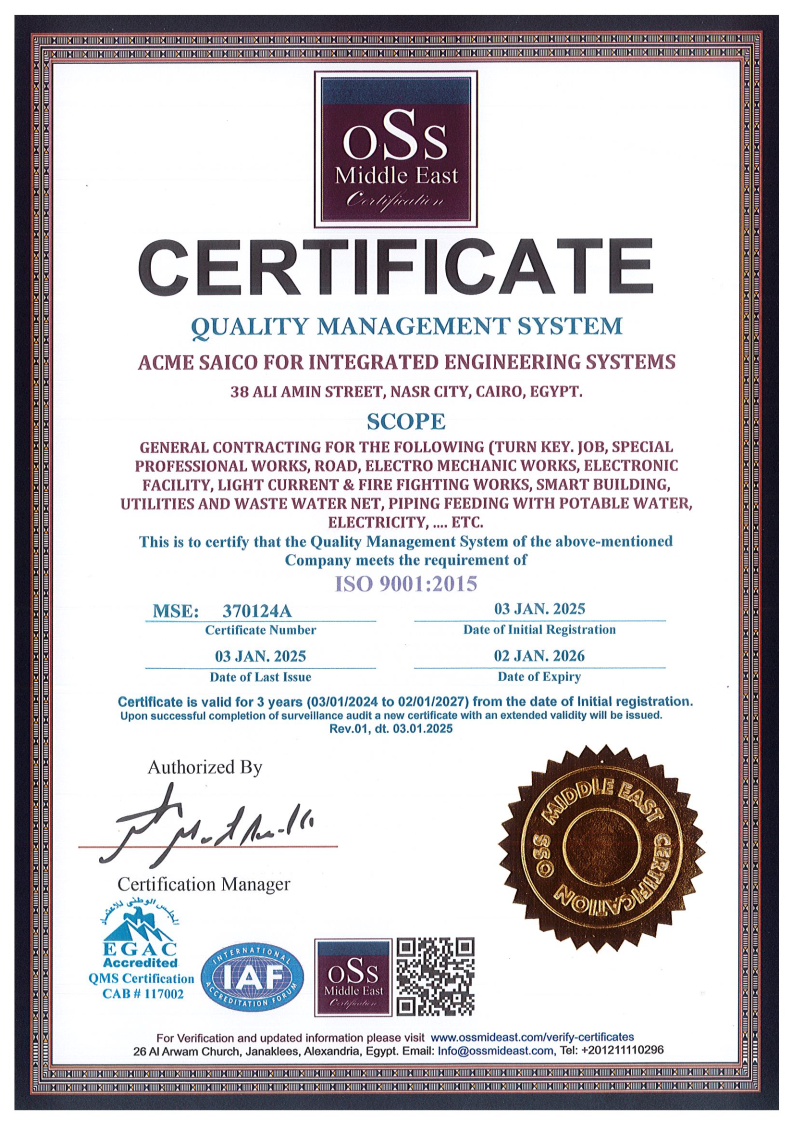 تُعد شركة أكمي إحدى الشركات الرائدة في مجال الإنشاءات والأنظمة الهندسية المتكاملة، تأسست عام 1985 ويقع مقرها الرئيسي في القاهرة – مصر. وبصفتها مقاولًا عامًا من الفئة “أ”، استطاعت الشركة أن تحجز مكانتها بين كبرى الشركات العاملة في السوق المصري، حيث نفذت العديد من المشروعات الكبرى بسجل أمني نموذجي، مع التزام صارم بأعلى معايير الصحة والسلامة.